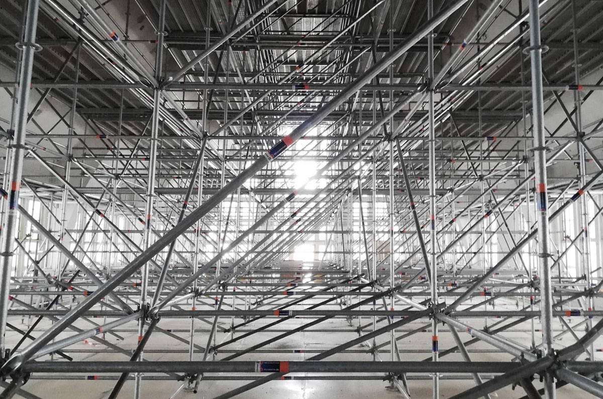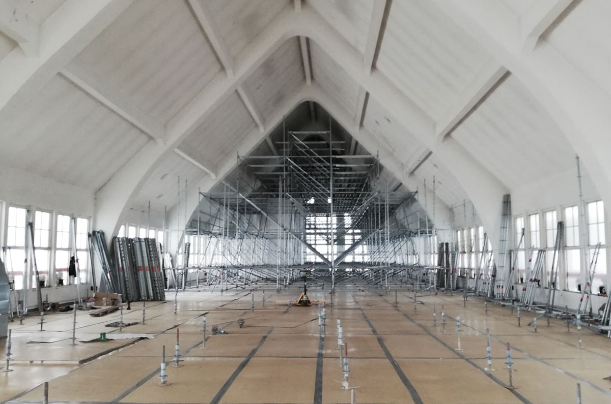 Die in bauzeitlicher Substanz erhaltene Halle in Eisenbetonbauweise wurde nach intensiven Bestandsuntersuchungen in enger Zusammenarbeit mit dem Denkmalschutz so saniert, dass sämtliche bauzeitlichen Oberflächen und Materialien in ihrer handwerklichen Qualität sichtbar erhalten bleiben. Dazu wurden umfangreiche Baubehelfe in Form von Wetterschutzdach außen und Raumgerüst innen über dem Verkaufsraum erstellt. Durch den Einsatz von aus einer Brückensanierung wiederverwendeten Holz-Brettschichtträgern und Holzbohlen konnte der Verkaufsraum nahezu stützenfrei überspannt werden und ein staubdichter Abschluss zu den darüber stattfindenden Betoninstandsetzungsarbeiten geschaffen werden, ohne den Handel mit offenen Lebensmitteln zu beeinträchtigen. Sowohl Brettschichtträger als auch Holzbohlen sind bereits zur Wiederverwendung als Tragwerk für das neue Verwaltungsdach vorgesehen und müssen nicht entsorgt werden. Sämtliche Überprüfungen zur Tragfähigkeit und Abbund der Holzträger können vor Ort ohne weitere Transportwege durchgeführt werden.